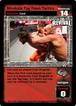 Can only be played from Ringside. When the first card played on your turn is a maneuver from Ringside or has the Tag logo, it is Multi and can only be reversed by 2 reversals.