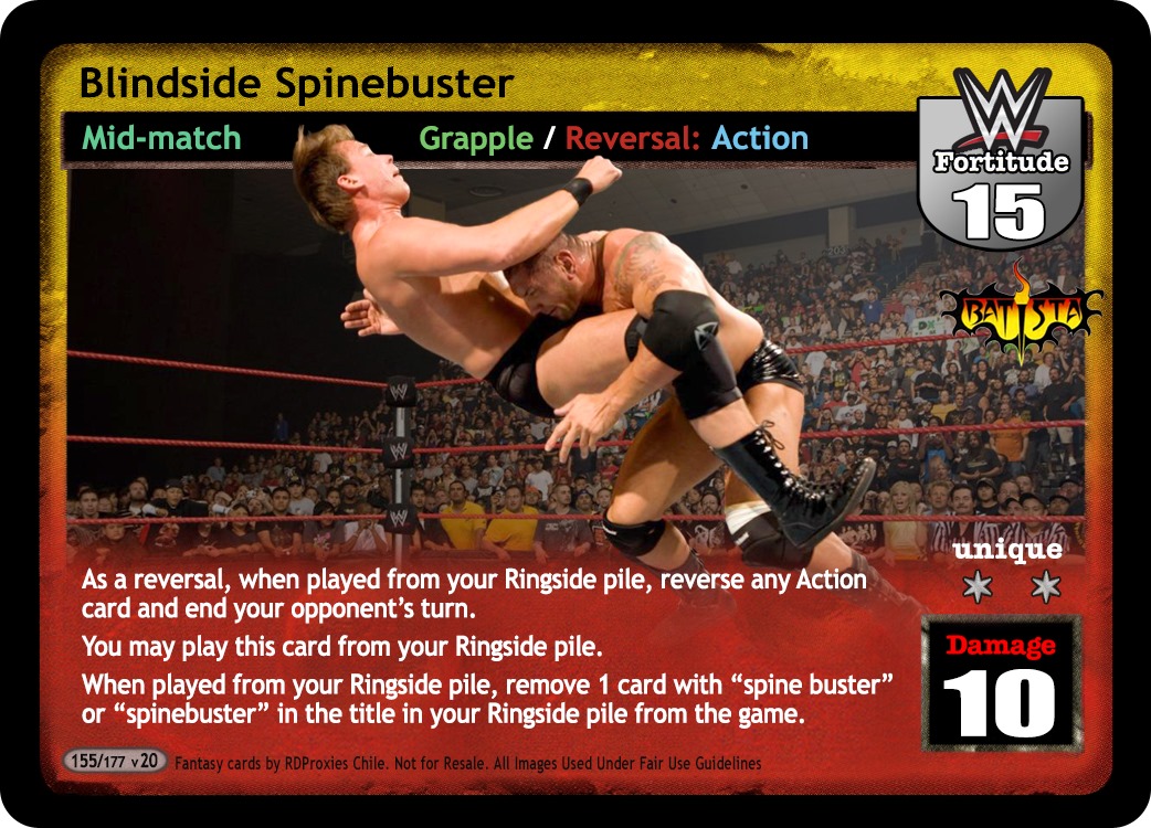 As a reversal, when played from your Ringside pile, reverse any Action card and end your opponent's turn. You may play this card from your Ringside pile. When played from your Ringside pile, remove 1 card with "spine buster" or "spinebuster" in the title in your Ringside pile from the game.