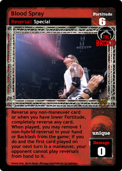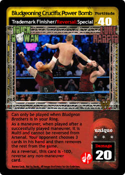 Can only be played when Bludgeon Brothers is in your Ring. As a maneuver, when played after a successfully played maneuver, it is Multi and cannot be reversed from Arsenal. Your opponent chooses 3 cards in his hand and then removes the rest from the game. As a reversal, this card is -10D, reverse any non-maneuver card.