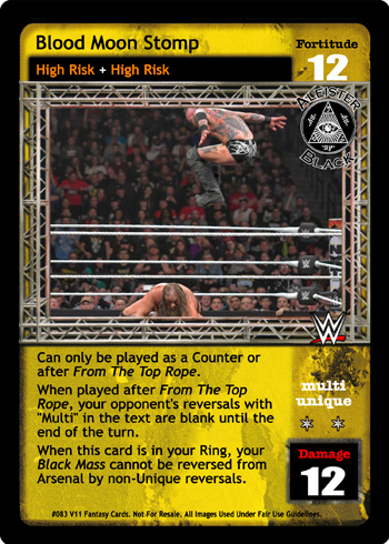 Can only be played as a Counter or after From The Top Rope. When played after From The Top Rope, your opponent's reversals with ‘Multi’ in the text are blank until the end of the turn. When this card is in your Ring, your Black Mass cannot be reversed from Arsenal by non-Unique reversals.