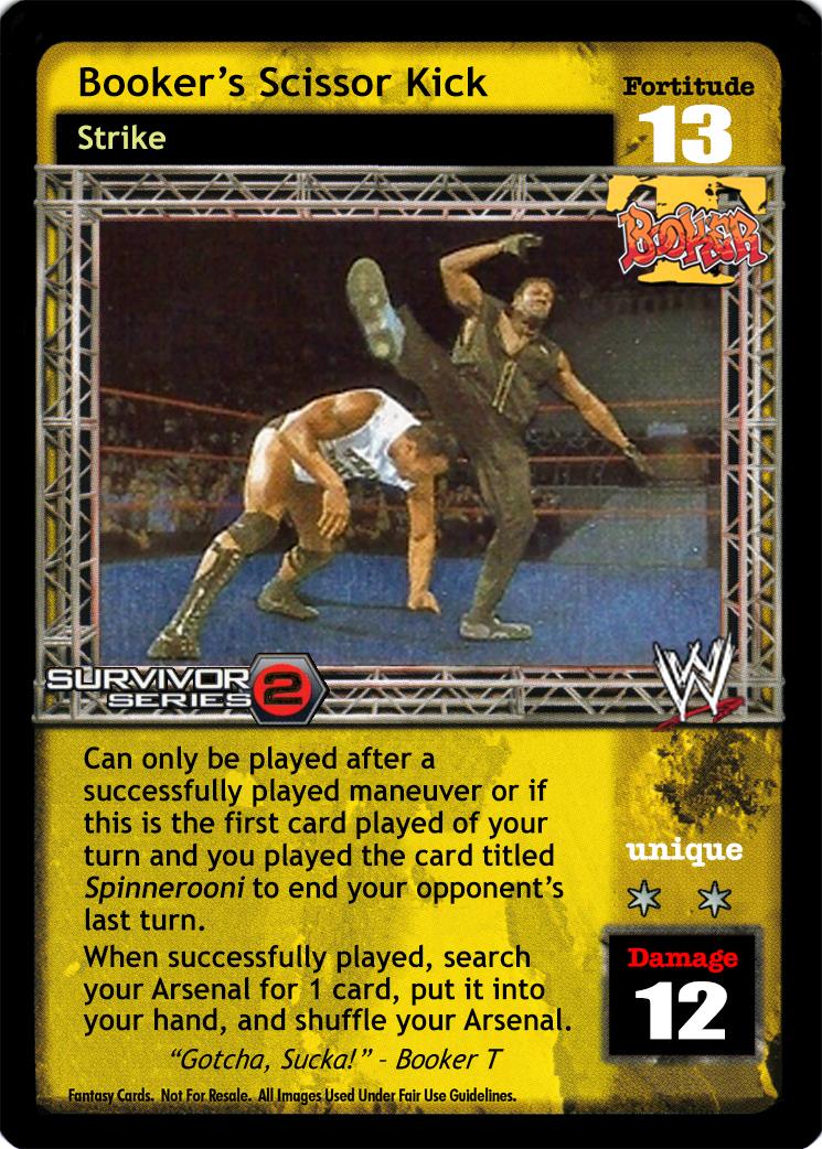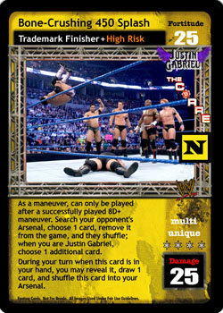 As a maneuver, can only be played after a successfully played 8D+ maneuver. Search your opponent's Arsenal, choose 1 card, remove it from the game, and they shuffle; when you are Justin Gabriel, choose 1 additional card. During your turn when this card is in your hand, you may reveal it, draw 1 card, and shuffle this card into your Arsenal.