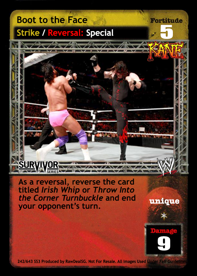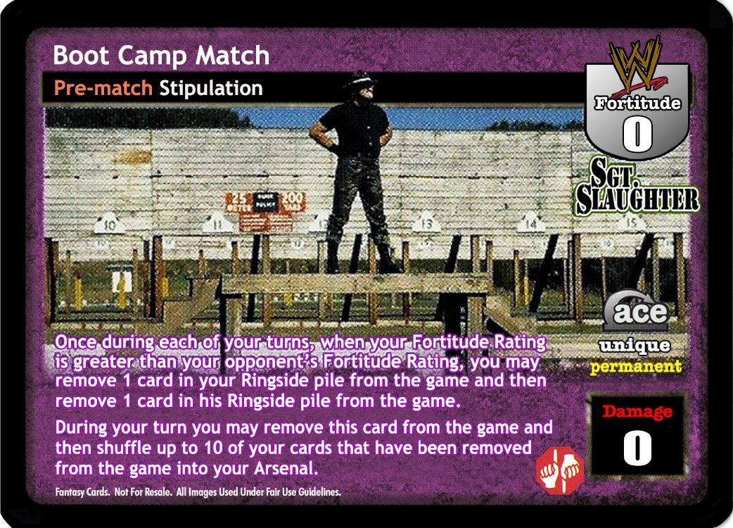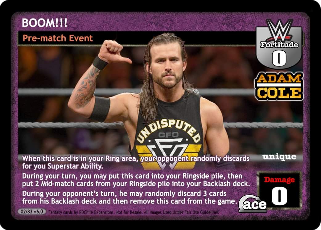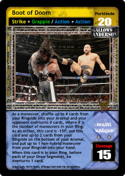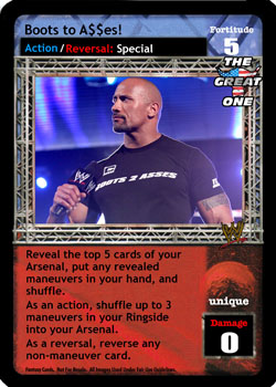 When this card is in your ring area, you opponent randomly discards for your superstar ability. During your turn, you may put this card into your ringside pile, then put 2 mid-match cards from your ringside pile into your backlash deck. During your opponent`s turn, he may randomly discard 3 cards from his backlash deck and then remove this card form the game.