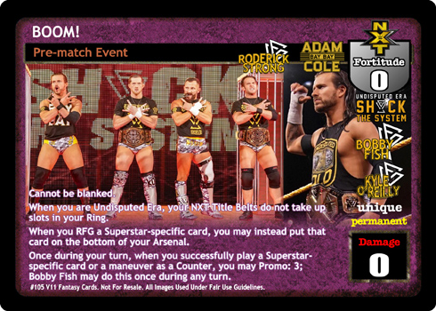 Cannot be blanked. When you are Undisputed Era, your NXT Title Belts do not take up slots in your Ring. When you RFG a Superstar-specific card, you may instead put that card on the bottom of your Arsenal. Once during your turn, when you successfully play a Superstar-specific card or a maneuver as a Counter, you may Promo: 3; Bobby Fish may do this once during any turn.