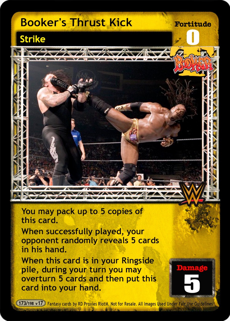 You may pack up to 5 copies of this card. When successfully played, your opponent randomly reveals 5 cards in his hand. When this card is in your Ringside pile, during your turn you may overturn 5 cards and then put this card into your hand.