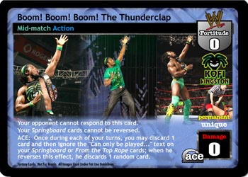 Your opponent cannot respond to this card. Your Springboard cards cannot be reversed. ACE: Once during each of your turns, you may discard 1 card and then ignore the 'Can only be played...' text on your Springboard or From the Top Rope cards; when he reverses this effect, he discards 1 random card.
