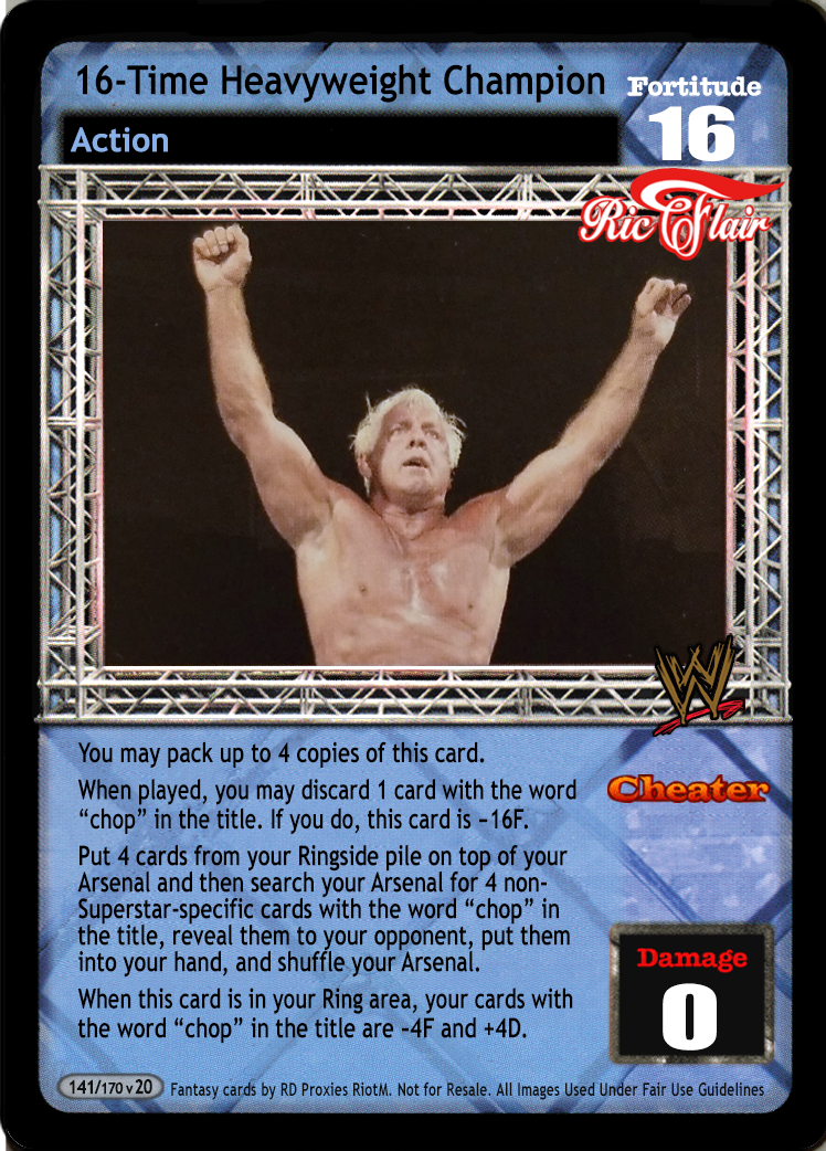 You may pack up to 4 copies of this card. When played, you may discard 1 card with the word "chop" in the title. If you do, this card is -16F. Put 4 cards from your Ringside pile on top of your Arsenal and then search your Arsenal for 4 non-Superstar-specific cards with the word "chop" in the title, reveal them to your opponent, put them into your hand, and shuffle your Arsenal. When this card is in your Ring area, your cards with the word "chop" in the title are -4F and +4D.
