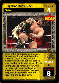 When played after a successfully played maneuver, cannot be reversed by non-Superstar-specific reversals from hand or Backlash. When this card is in your hand and you overturn cards, you may discard this card and 1 other card instead of overturning.