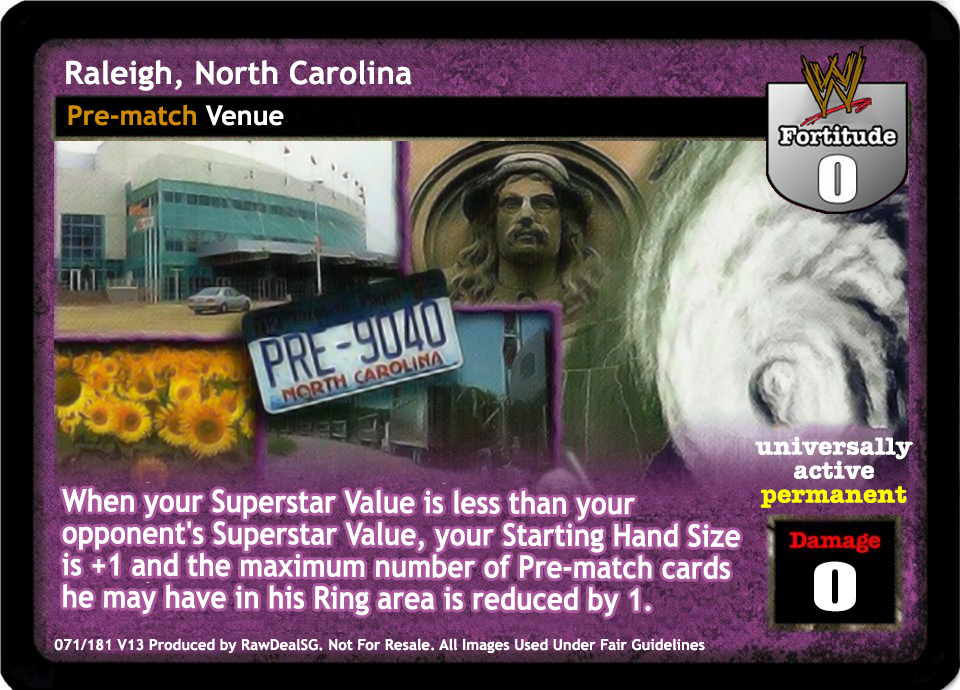 After all Pre-matches are resolved and you do not have a Stipulation in your Ring, reveal this card. When packing this card, you are a WCW Superstar, and you may pack up to 3 different Stipulations in your Backstage Area. When revealed, put any number of Stipulations from your Backstage Area into your Ring, and when you overturn a non-hybrid maneuver for your Ability, you may put it in your hand instead. Your Running Bulldog and Drop Toe Hold cards are Chain when played.