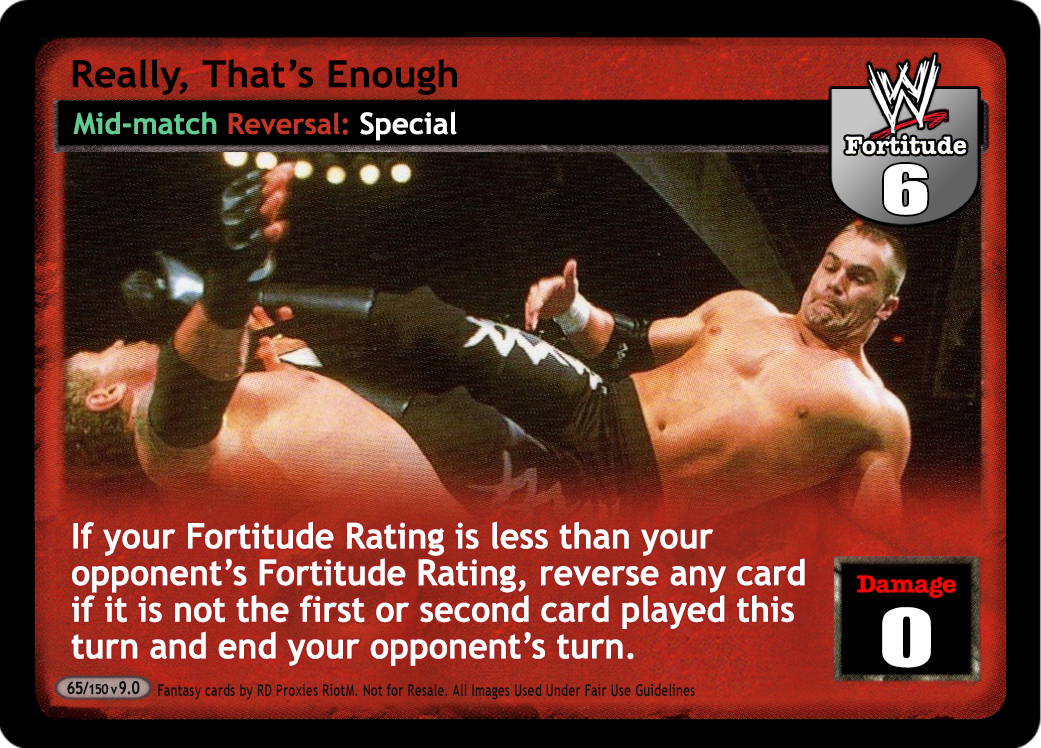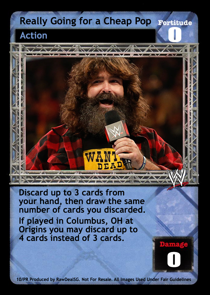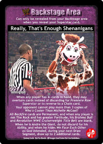 When any player has 4- cards in hand, they may overturn cards instead of discarding to Premiere Raw Superstar or to reverse to a Chain card. Your opponent cannot play more than 3 copies of Who's Cooler Than Michelle McCool?. All Backfire cards are Permanent, and when any player is not The Rock and has greater Fortitude, his Brahma Bull and Revolution WWE Cruiserweight Title Belt are blank. When he is Andre the Giant, do not discard for his Ability, and when he hides We Face Each Other as God Intended, during your next Draw Segment, draw up to 2 additional cards.
