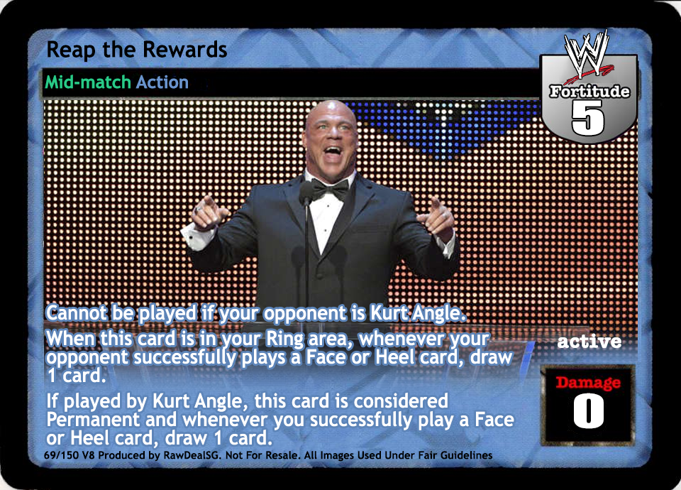 Cannot be played if your opponent is Kurt Angle. When this card is in your Ring area, whenever your opponent successfully plays a Face or Heel card, draw 1 card. If played by Kurt Angle, this card is considered Permanent and whenever you successfully play a Face or Heel card, draw 1 card.