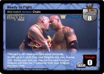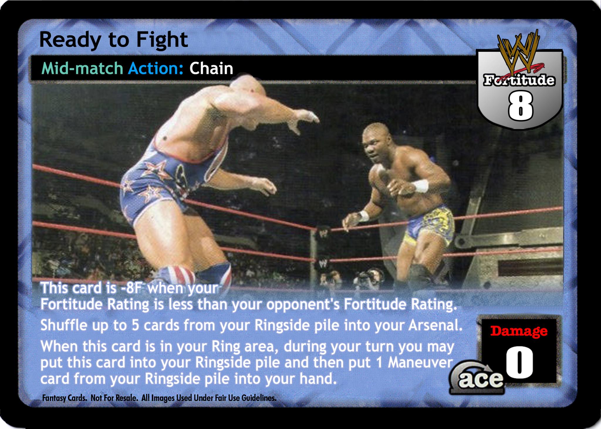 This card is -8F when your have lower Fortitude. Shuffle up to 4 cards from your Ringside into your Arsenal. ACE: During your turn you may put this card into your Ringside and then put 1 maneuver from your Ringside into your hand.