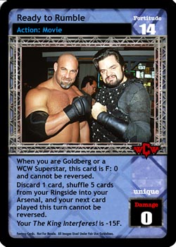 When you are Goldberg or a WCW Superstar, this card is F: 0 and cannot be reversed. Discard 1 card, shuffle 5 cards from your Ringside into your Arsenal, and your next card played this turn cannot be reversed. Your The King Interferes! is -15F.