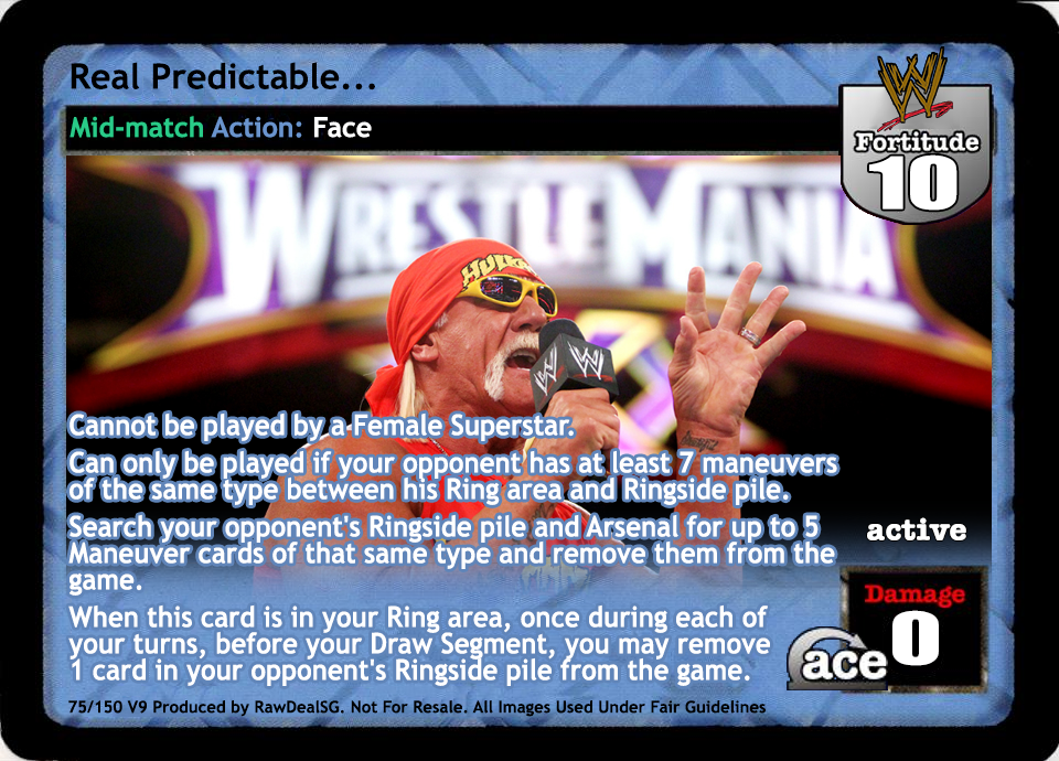 Cannot be played by a Female Superstar. Can only be played if your opponent has at least 7 maneuvers of the same type between his Ring area and Ringside pile. Search your opponent's Ringside pile and Arsenal for up to 5 Maneuver cards of that same type and remove them from the game. When this card is in your Ring area, once during each of your turns, before your Draw Segment, you may remove 1 card in your opponent's Ringside pile from the game.