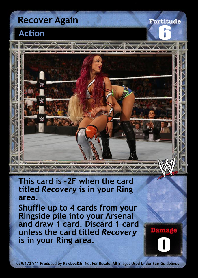 This card is -2F when the card titled Recovery is in your Ring area. Shuffle up to 4 cards from your Ringside pile into your Arsenal and draw 1 card. Discard 1 card unless the card titled Recovery is in your Ring area.