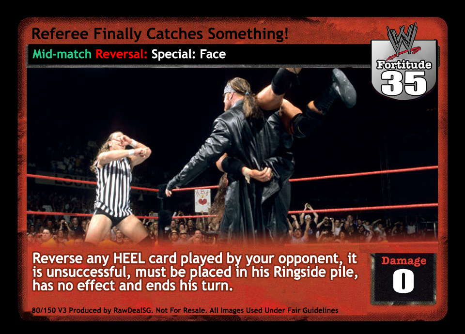 Reverse any HEEL card played by your opponent, it is unsuccessful, must be placed in his Ringside pile, has no effect and ends his turn.