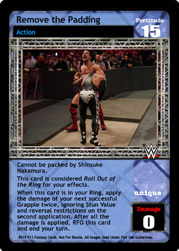 Cannot be packed by Shinsuke Nakamura. This card is considered Roll Out of the Ring for your effects. When this card is in your Ring, apply the damage of your next successful Grapple twice, ignoring Stun Value and reversal restrictions on the second application. After all the damage is applied, RFG this card and end your turn.