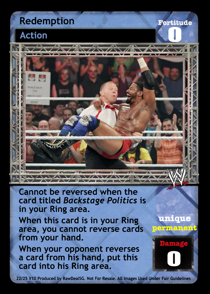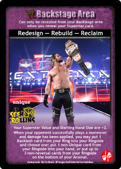 Your Superstar Value and Starting Hand Size are +2. When your opponent successfully plays a maneuver and damage has been applied, you may put 1 Backlash card from your Ring into your Ringside and choose one: put 1 non-Unique card from your Ringside into your hand, or put 3 non-reversal cards from your Ringside on the bottom of your Arsenal.