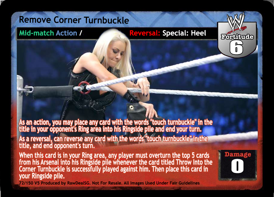 As an action, you may place any card with the words "touch turnbuckle" in the title in your opponent's Ring area into his Ringside pile and end your turn. As a reversal, can reverse any card with the words "touch turnbuckle" in the title, and end opponent's turn. When this card is in your Ring area, any player must overturn the top 5 cards from his Arsenal into his Ringside pile whenever the card titled Throw Into the Corner Turnbuckle is successfully played against him. Then place this card in your Ringside pile.