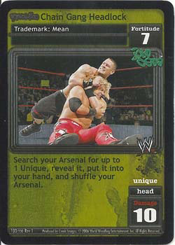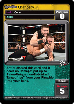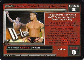 Requirement: 'Revolution Tomorrow's WWE½ Legends' Faction in your Ring. Put up to 1 card from your opponent's Ring into his Ringside. If you have 3 or more Superstar-specifics from 'Tomorrow's WWE Legends' Faction Members and/or cards with 'Tomorrow's WWE Legends' in the text in your Ring, your opponent discards 2 cards.