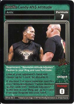 Requirement: 'Revolution Attitude Adjusters' Faction in your Ring and Less Fortitude. Look at your opponent's hand and choose up to 1 card: he discards it. If you have 3 or more Superstar-specifics from 'Attitude Adjusters' Faction Members and/or cards with 'Attitude Adjusters' in the text in your Ring, put up to 1 card from your Ringside into your hand.