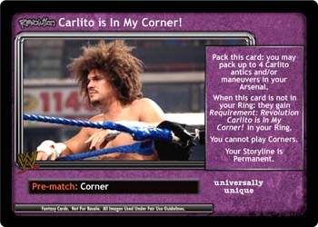 Pack this card: you may pack up to 4 Carlito antics and/or maneuvers in your Arsenal. When this card is not in your Ring: they gain Requirement: Revolution Carlito Is In My Corner! in your Ring. You cannot play Corners. Your Storyline is Permanent.