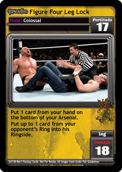 Requirement: Revolution WWE's Powerhouses is in your Ring. Discard 2 random cards: search your Arsenal for 1 non-Unique maneuver, 1 non-Unique antic, and 1 non-Unique reversal; reveal them, put them into your hand, and shuffle. When you are a Powerhouse: your next card played this turn is -5F.