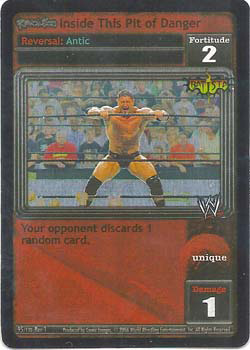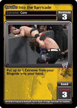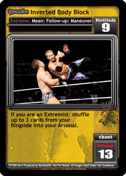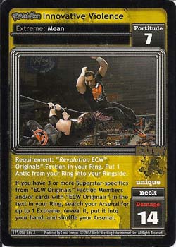 Requirement: 'Revolution ECW½ Originals' Faction in your Ring. Put 1 Antic from your Ring into your Ringside. If you have 3 or more Superstar-specifics from 'ECW Originals' Faction Members and/or cards with 'ECW Originals' in the text in your Ring, search your Arsenal for up to 1 Extreme, reveal it, put it into your hand, and shuffle your Arsenal.