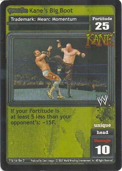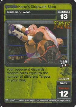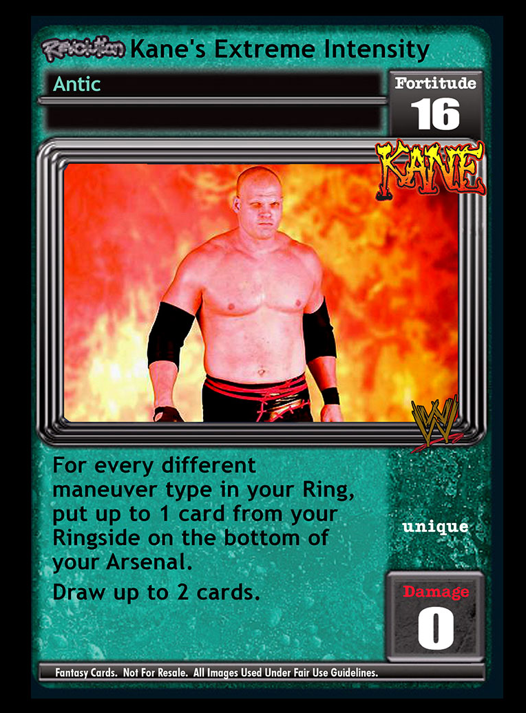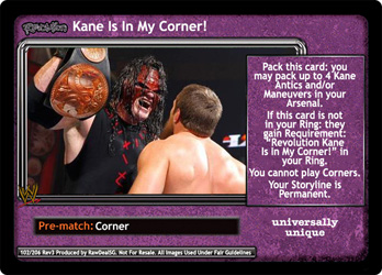 Pack this card: you may pack up to 4 Kane Antics and/or Maneuvers in your Arsenal. If this card is not in your Ring: they gain Requirement: 'Revolution Kane Is In My Corner!' in your Ring. You cannot play Corners. Your Storyline is Permanent. Universally Unique
