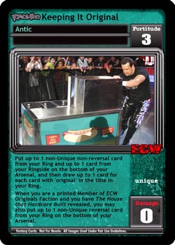 Put up to 1 non-Unique non-reversal card from your Ring and up to 1 card from your Ringside on the bottom of your Arsenal, and then draw up to 1 card for each card with µoriginal' in the title in your Ring. When you are a printed Member of ECW Originals Faction and you have The House That Hardcore Built revealed, you may also put up to 1 non-Unique reversal card from your Ring on the bottom of your Arsenal.