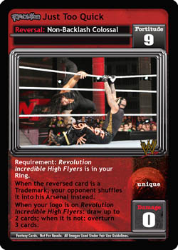 Requirement: Revolution Incredible High Flyers is in your Ring. When the reversed card is a Trademark, your opponent shuffles it into his Arsenal instead. When your logo is on Revolution Incredible High Flyers: draw up to 2 cards; when it is not: overturn 3 cards.