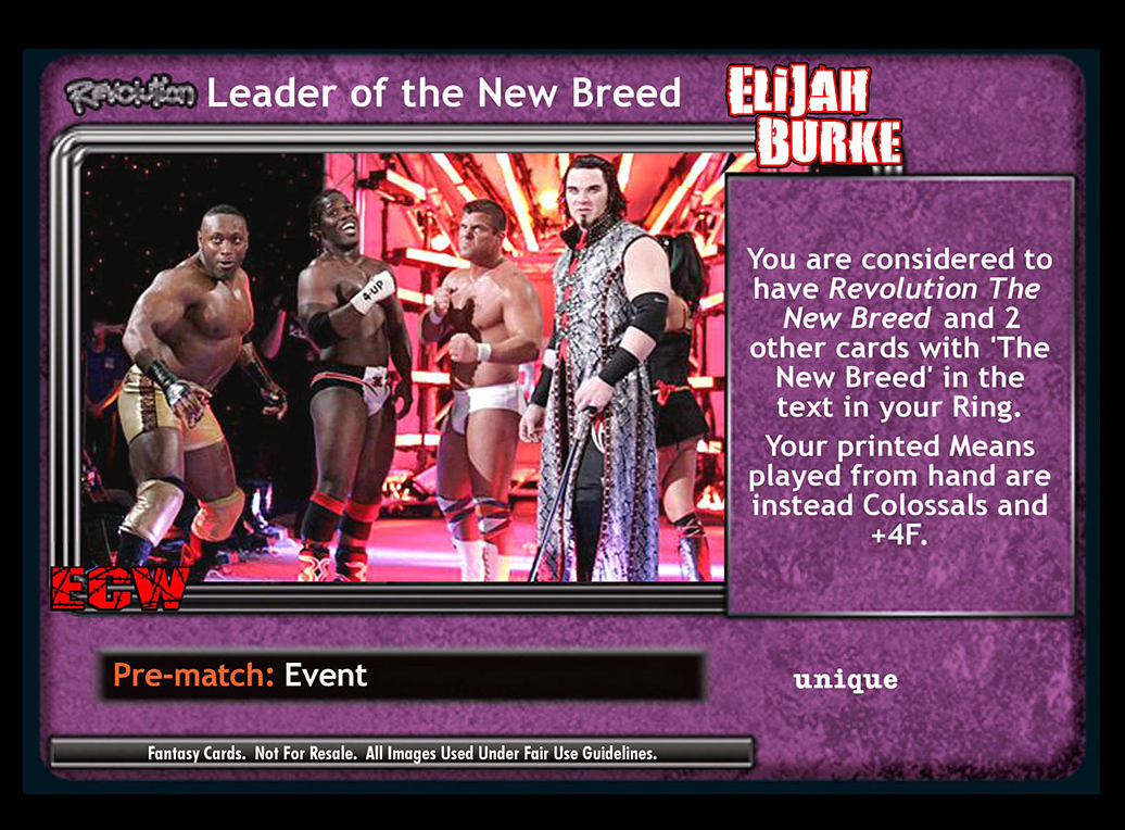 You are considered to have Revolution The New Breed and 2 other cards with 'The New Breed' in the text in your Ring. Your printed Means played from hand are instead Colossals and +4F.