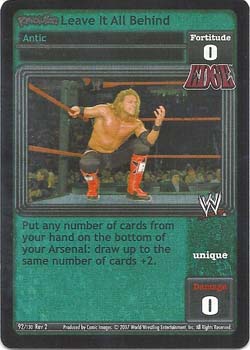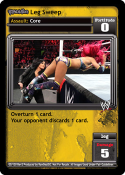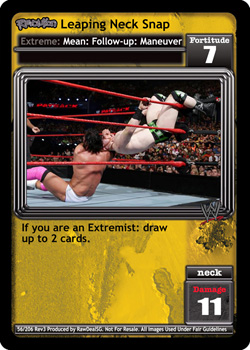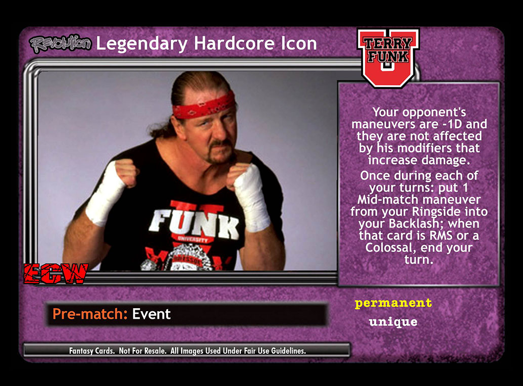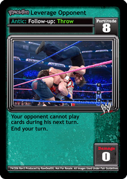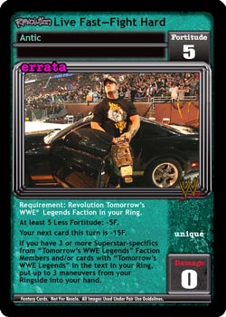 Requirement: 'Revolution Tomorrow's WWE½ Legends' Faction in your Ring. At least 5 Less Fortitude: -5F. Your next card this turn is -15F. If you have 3 or more Superstar-specifics from 'Tomorrow's WWE Legends' Faction Members and/or cards with 'Tomorrow's WWE Legends' in the text in your Ring, put up to 3 Maneuvers from your Ringside into your hand.