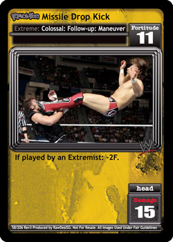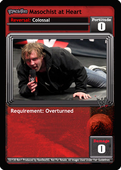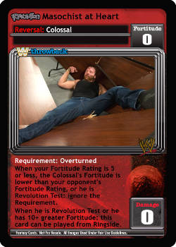 Requirement: Overturned. When your Fortitude Rating is 5 or less, the Colossal's Fortitude is lower than your opponent's Fortitude Rating, or he is Revolution Test: ignore the Requirement. When he is Revolution Test or he has 10+ greater Fortitude: this card can be played from Ringside.