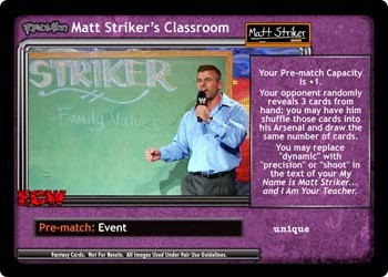 Your Pre-match Capacity is +1. Your opponent randomly reveals 3 cards from hand: you may have him shuffle those cards into his Arsenal and draw the same number of cards. You may replace 'dynamic' with 'precision' or 'shoot' in the text of your My Name is Matt Striker... and I Am Your Teacher.