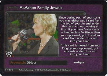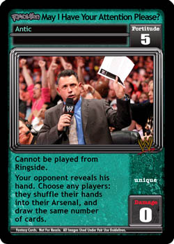 Cannot be played from Ringside. Your opponent reveals his hand. Choose any players: they shuffle their hands into their Arsenal, and draw the same number of cards.