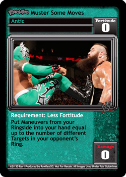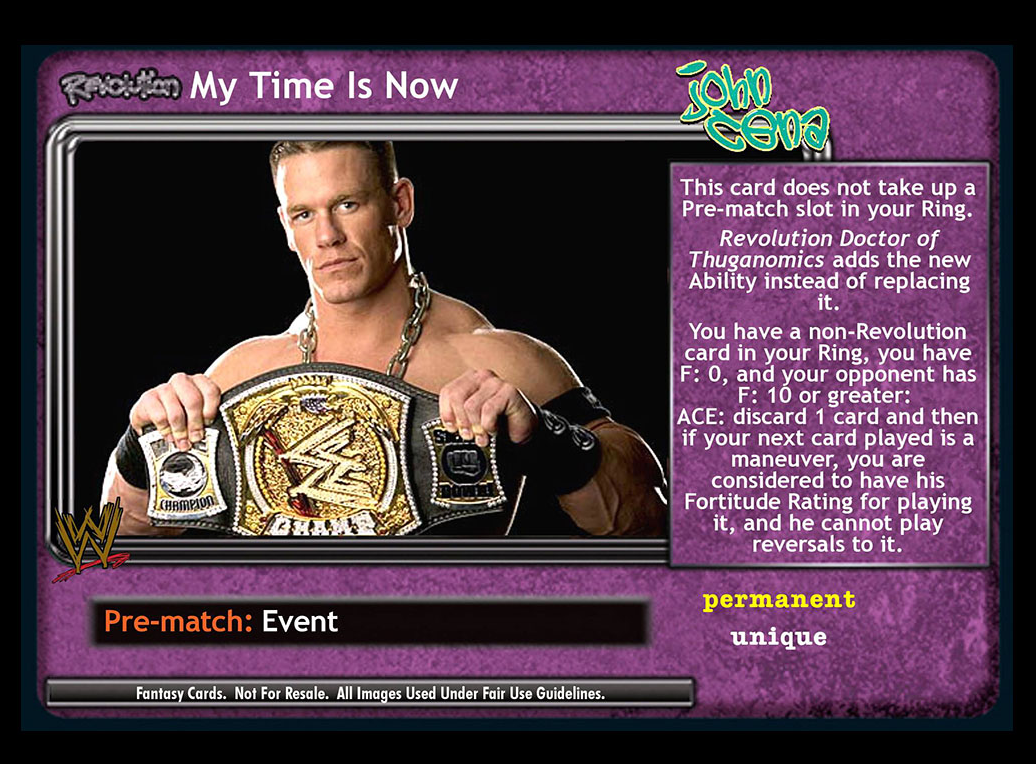 This card does not take up a Pre-match slot in your Ring. Revolution Doctor of Thuganomics adds the new Ability instead of replacing the printed Ability. You have a non-Revolution card in your Ring, you have F: 0, and your opponent has F: 10 or greater: ACE: discard 1 card and then if your next card played is a maneuver, you are considered to have his Fortitude Rating for playing it, and he cannot play reversals to it.