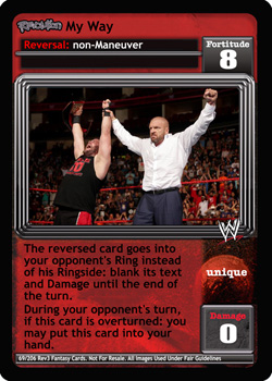 The reversed card goes into your opponent's Ring instead of his Ringside: blank its text and Damage until the end of the turn. During your opponent's turn, if this card is overturned: you may put this card into your hand.