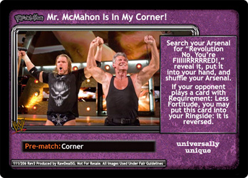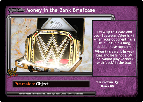 Draw up to 1 card and your Superstar Value is +1; when your opponent has a Title Belt in his Ring, double those numbers. When this card is in your Ring and he is not a GM, he cannot play Corners with 'pack' in the text.