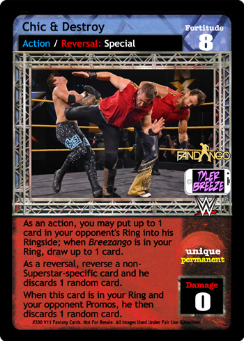 As an action, you may put up to 1 card in your opponent's Ring into his Ringside; when Breezango is in your Ring, draw up to 1 card. As a reversal, reverse a non-Superstar-specific card and he discards 1 random card. When this card is in your Ring and your opponent Promos, he then discards 1 random card.