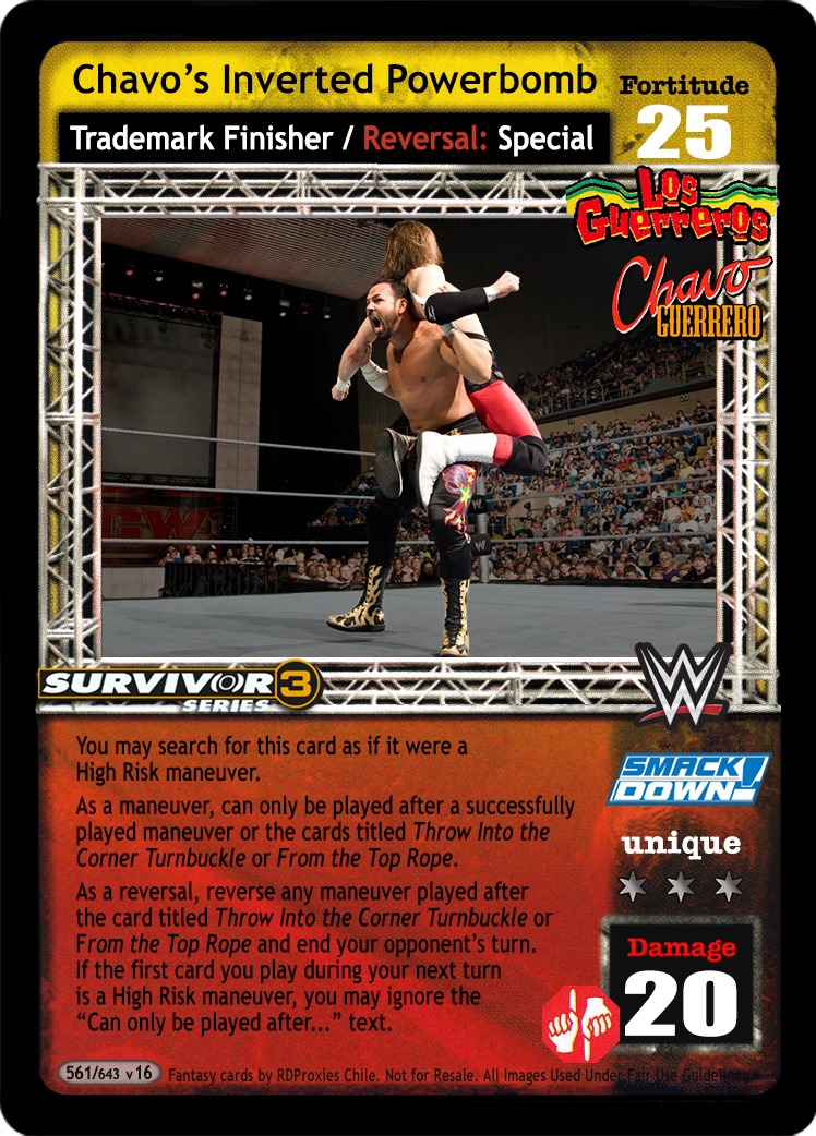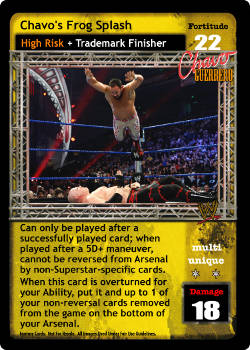 You may search for this card as if it were a High Risk maneuver. As a maneuver, can only be played after a successfully played maneuver or the cards titled Throw Into the Corner Turnbuckle or From the Top Rope. As a reversal, reverse any maneuver played after the card titled Throw Into the Corner Turnbuckle or From the Top Rope and end your opponent's turn. If the first card you play on your next turn is a High Risk maneuver, you can ignore the "Can only be played after..." text.