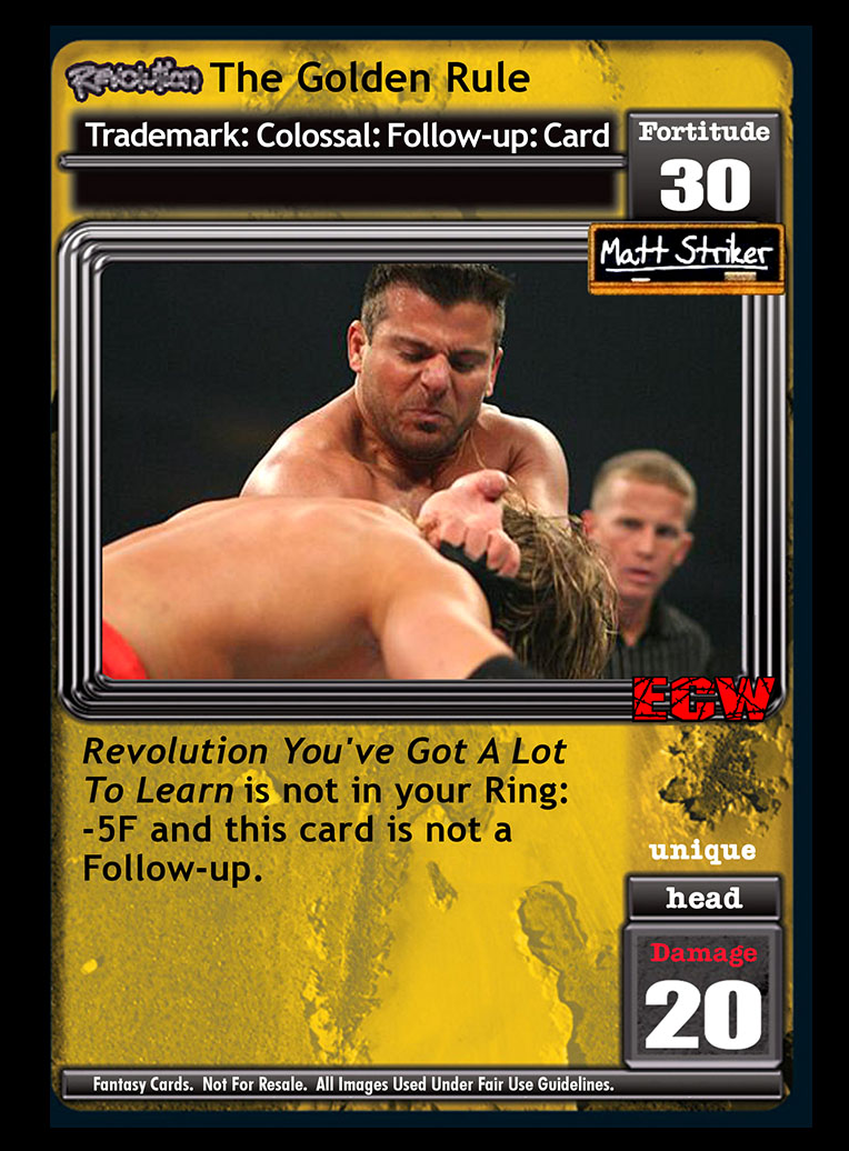 Requirement: 'Revolution The New Breed' Faction in your Ring. Put up to 2 Assaults and/or Extremes from your Ringside into your hand. If you have 3 or more Superstar-specifics from 'The New Breed' Faction Members and/or cards with 'The New Breed' in the text in your Ring, put up to 1 non-Unique from your opponent's Ring into his Ringside.