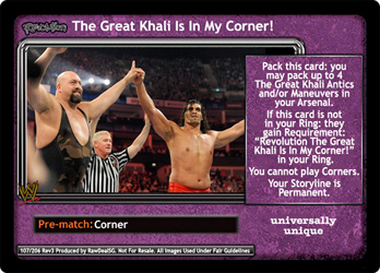 Pack this card: you may pack up to 4 The Great Khali Antics and/or Maneuvers in your Arsenal. If this card is not in your Ring: they gain Requirement: 'Revolution The Great Khali Is In My Corner!' in your Ring. You cannot play Corners. Your Storyline is Permanent.