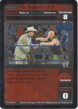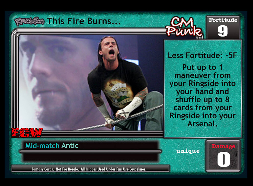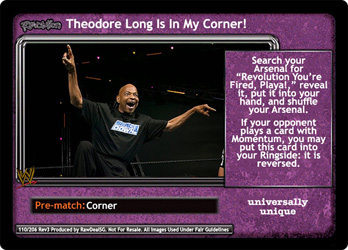 Search your Arsenal for 'Revolution You're Fired, Playa!,' reveal it, put it into your hand, and shuffle your Arsenal. If your opponent plays a card with Momentum, you may put this card into your Ringside: it is reversed.