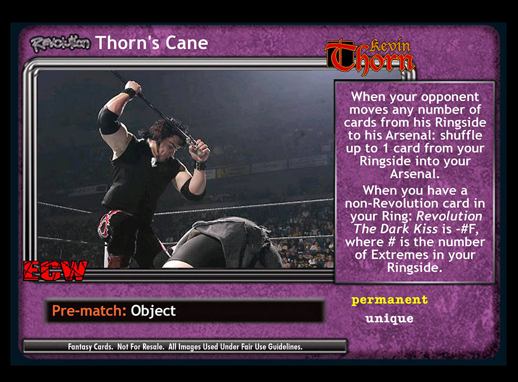 When your opponent moves any number of cards from his Ringside to his Arsenal: shuffle up to 1 card from your Ringside into your Arsenal. When you have a non-Revolution card in your Ring: Revolution The Dark Kiss is -#F, where # is the number of Extremes in your Ringside.
