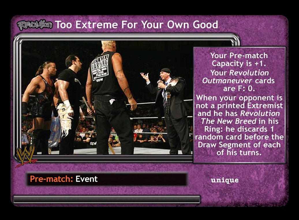 The maximum Pre-match you may have in your Ring is increased by 1. Your Revolution Outmaneuver cards are F: 0. When your opponent is not a printed Extremist and he has Revolution The New Breed in his Ring: he discards 1 random card before the Draw Segment of each of his turns.
