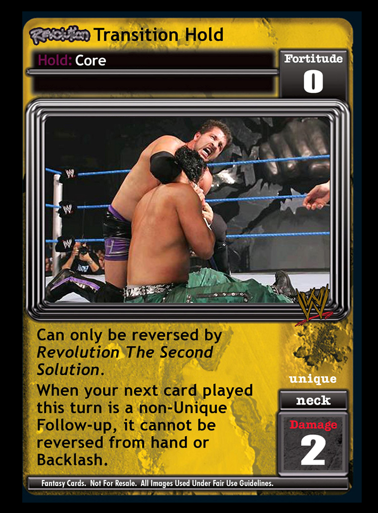 If your next card is a maneuver, it cannot be reversed by Unique Mid-match Reversals. When you have 3 or more other cards with 'Attitude Adjusters' in the text or Superstar-specifics from Attitude Adjusters members, once during each of your turns you may discard 2 cards: put this card into your hand.