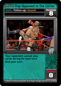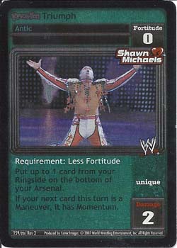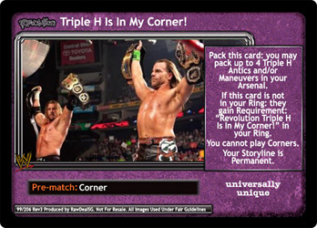 Pack this card: you may pack up to 4 Triple H Antics and/or Maneuvers in your Arsenal. If this card is not in your Ring: they gain Requirement: 'Revolution Triple H Is In My Corner!' in your Ring. You cannot play Corners. Your Storyline is Permanent.