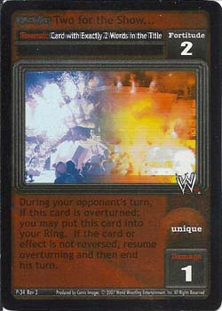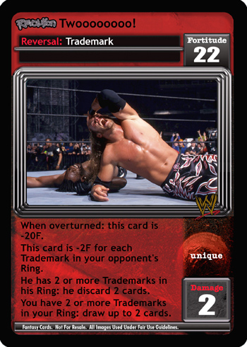 When overturned: this card is -20F. This card is -2F for each Trademark in your opponent's Ring. He has 2 or more Trademarks in his Ring: he discard 2 cards. You have 2 or more Trademarks in your Ring: draw up to 2 cards.