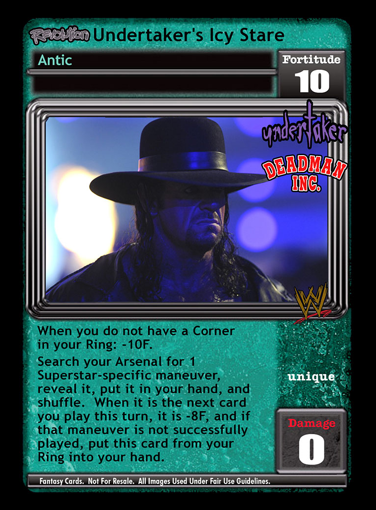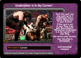 Pack this card: you may pack up to 4 Undertaker Antics and/or Maneuvers in your Arsenal. If this card is not in your Ring: they gain Requirement: 'Revolution Undertaker Is In My Corner!' in your Ring. You cannot play Corners. Your Storyline is Permanent.