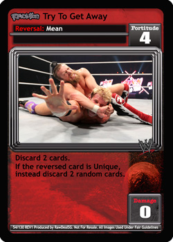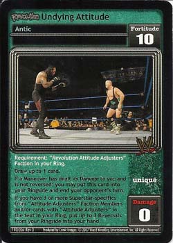 Requirement: 'Revolution Attitude Adjusters' Faction in your Ring. Draw up to 1 card. If a Maneuver has dealt its Damage to you and is not reversed: you may put this card into your Ringside and end your opponent's turn. If you have 3 or more Superstar-specifics from 'Attitude Adjusters' Faction Members and/or cards with 'Attitude Adjusters' in the text in your Ring, put up to 3 Reversals from your Ringside into your hand.